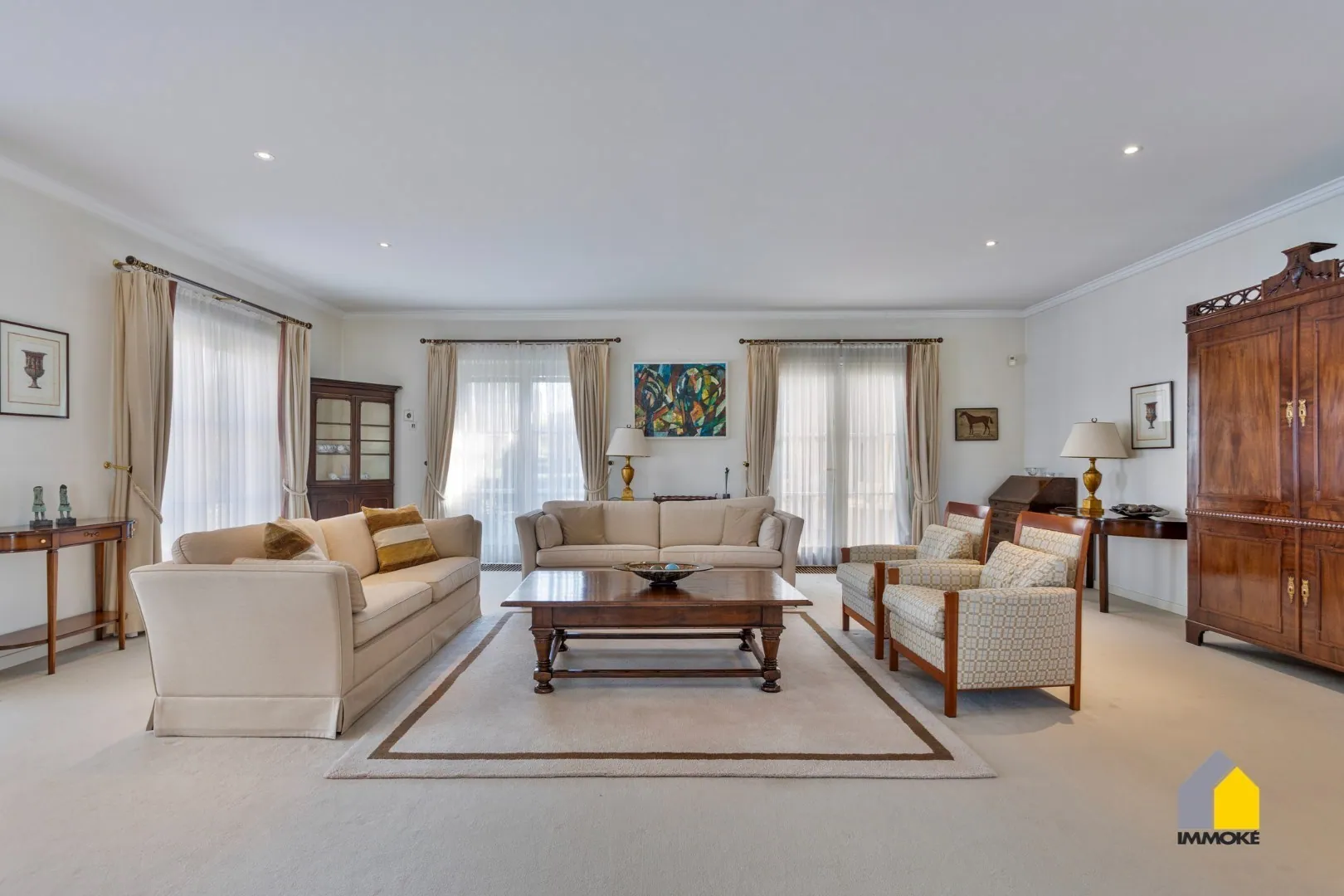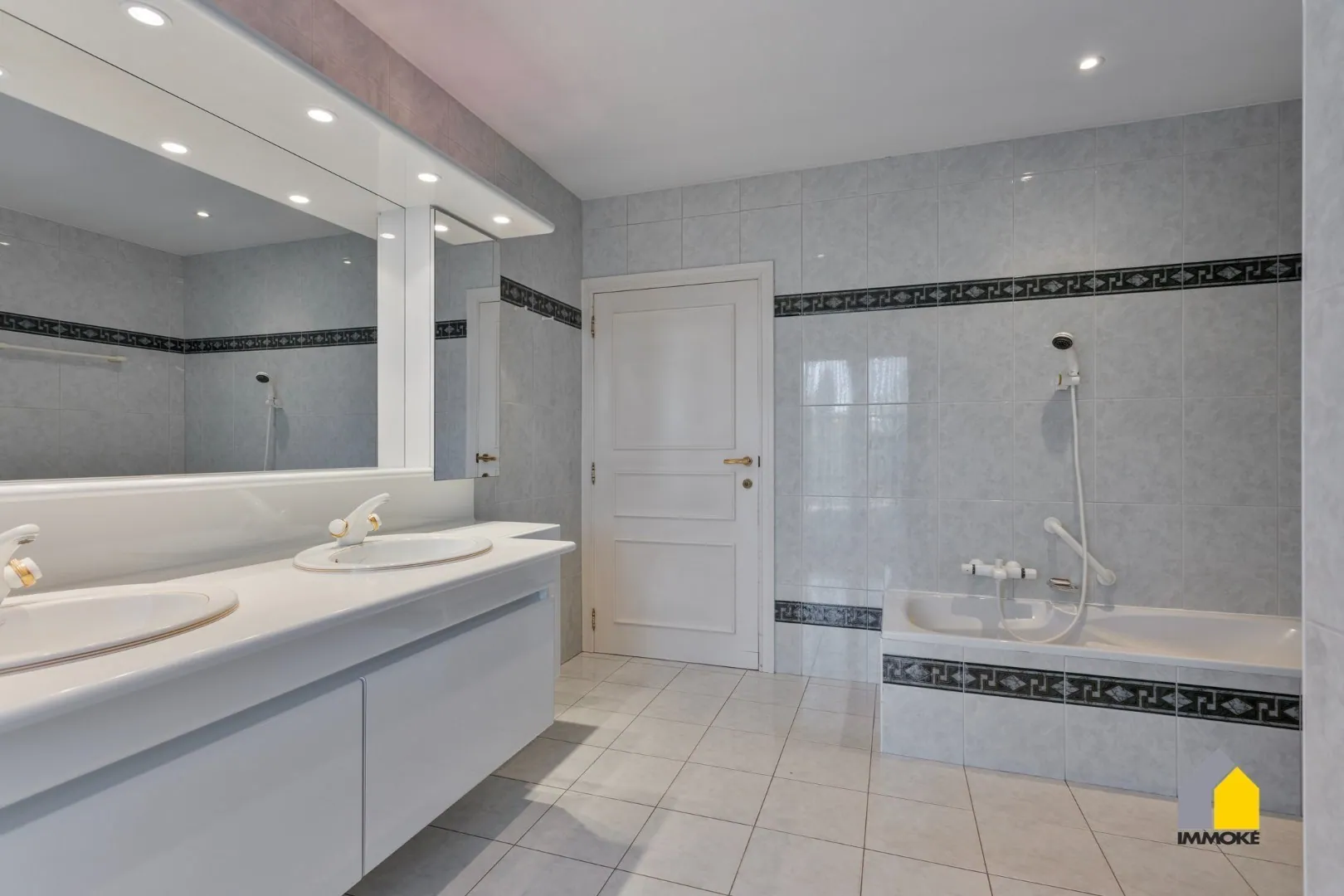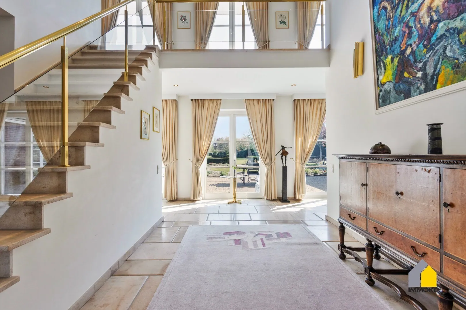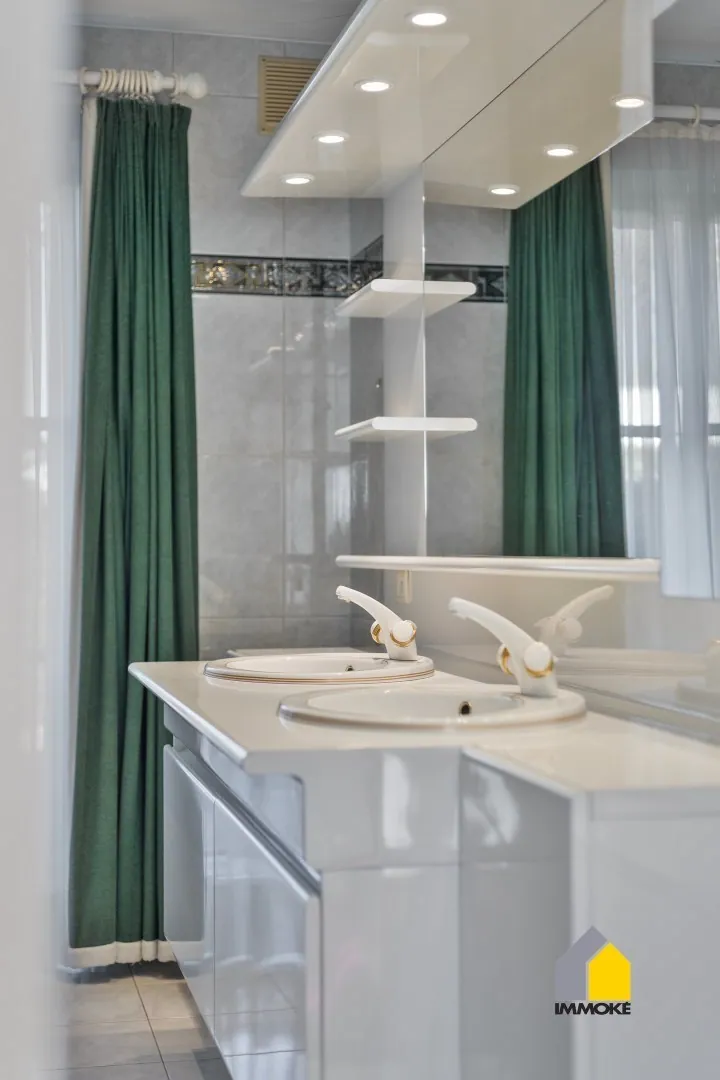 - GELIJKVLOERS: U wordt verwelkomd in een imposante inkomhal met een mooie, natuurstenen trap en hoge raampartijen die een prachtig zicht bieden op de riante tuin. Een vestiaire zorgt voor praktische opbergruimte. De royale L-vormige woonkamer (52 m²) baadt in het licht dankzij de grote raampartijen en vloeit naadloos over in een sfeervolle tuinkamer met openslaande deuren naar het zonnige terras. Aansluitend bevindt zich de ruime leefkeuken (5,10 x 4 m), uitgerust met een marmeren werkblad, dubbele RVS spoelbak, vitrokeramisch fornuis, afzuigkap, vaatwasser, koelkast, oven en magnetron. Een glazen deur leidt vanuit de keuken naar een lichte gaanderij met panoramische raampartijen en toegang tot een gezellig, ingesloten terras en de tuin. Verder biedt het gelijkvloers een gang met gastentoilet, een dubbele garage (6 x 6 m) met automatische sectionale poort, een praktische wasplaats met buitendeur, een ruime slaapkamer (6 x 4 m) en een volledig betegelde badkamer (3,96 x 3,36 m) met dubbele wastafel, ligbad, inloopdouche en een comfortabel Japans toilet.